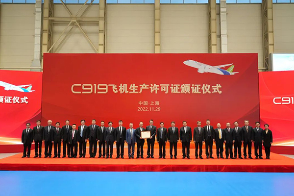 2022年11月29日,中国民航局向中国商飞公司颁发C919大型客机生产许可证(PC)。取得生产许可证是C919大型客机从设计研制阶段到批量生产阶段的重要里程碑,标志着C919大型客机向产业化发展迈出了坚实一步。