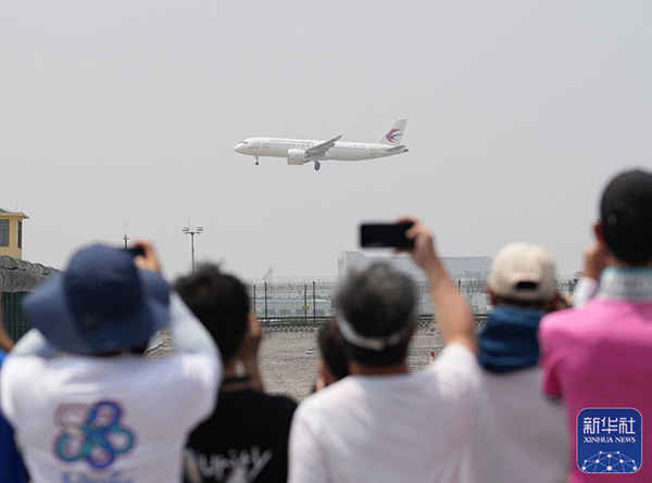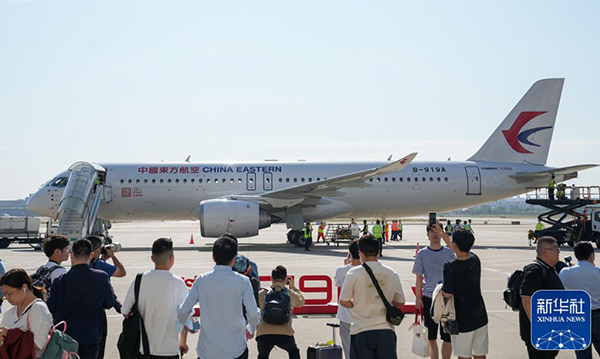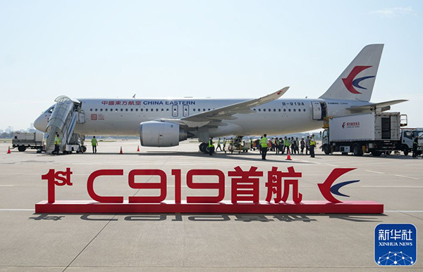 5月28日,C919首个商业航班东航MU9191飞抵北京首都国际机场。 新华社记者鞠焕宗摄