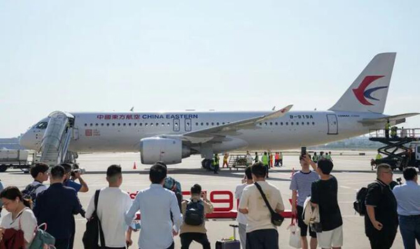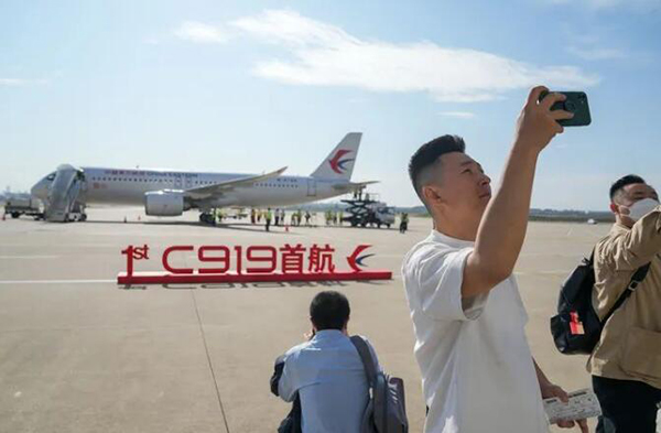 5月28日,旅客与即将首航的C919飞机合影。新华社记者 丁汀 摄