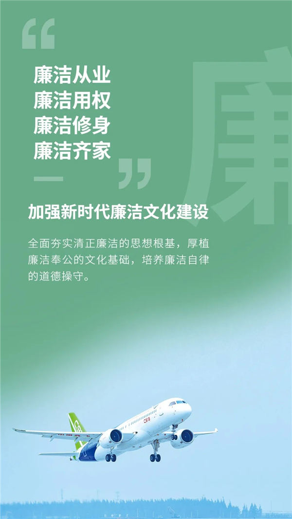 通过加强新时代廉洁文化建设,持续弘扬以“二二三三” 为主要内容的“廉洁商飞”理念,坚持政治引领、结合实际、突出重点、常长结合、协同贯通五项原则,用好“思想引廉、教育倡廉、领导率廉、典型示廉、案例警廉、制度固廉、家风润廉、共建保廉、监督促廉”九大载体和途径,培育新时代具有鲜明商飞特色的廉洁观:始终敬畏组织、敬畏群众、敬畏纪法,做到一心为公、一身正气、一尘不染,保持清白做人、清正干事、清廉翱翔。