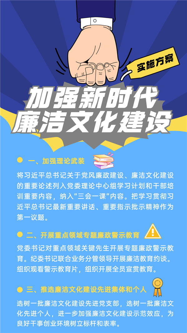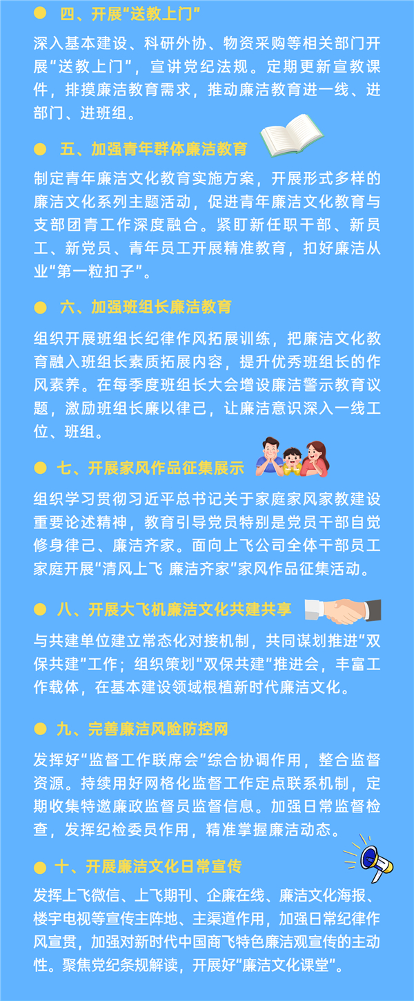为认真贯彻落实中央及中国商飞公司关于加强新时代廉洁文化建设的相关要求,强化党员、干部廉洁自律意识,强化和完善拒腐防变教育机制,上飞公司制定《加强新时代廉洁文化建设的实施方案》,聚焦党风廉政建设和反腐败工作实践,把加强廉洁文化建设作为一体推进“三不腐”的基础性工程抓紧抓实抓好,为推进上飞公司全面从严治党向纵深发展提供重要支撑。