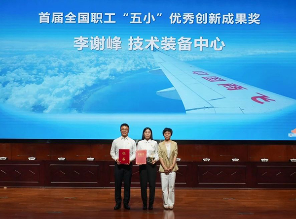 ▲唐雪峰为首届全国职工“五小”优秀创新成果奖获得者李谢峰、国防邮电产业第二届复合材料职工职业技能竞赛复材装配钳工第三名获得者刘晓忱颁奖