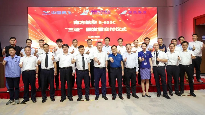 ▲中国商飞公司党委常委、副总经理张玉金向南方航空接机团队领队徐海峰交付飞机“钥匙”