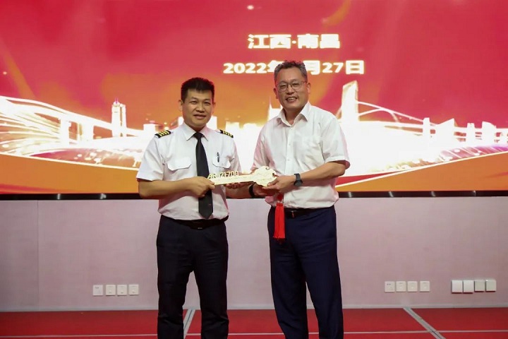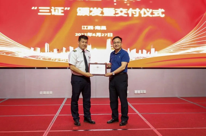 ▲民航江西监管局党委副书记、纪委书记蒙健民分别向南方航空接机团队领队徐海峰,成都航空总工程师孙家梁颁发飞机国籍登记证和单机适航证