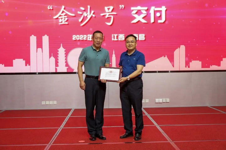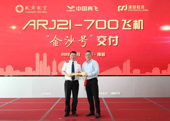 ▲中国商飞公司党委常委、副总经理张玉金向成都航空总经理查光忆交付“金沙号”飞机“钥匙”