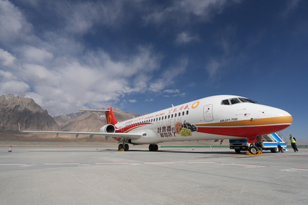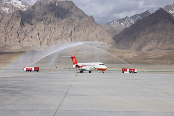 7月2日,一架身披成都航空航徽“太阳神鸟”涂装的ARJ21飞机从喀什徕宁国际机场起飞前往塔什库尔干塔吉克自治县(简称“塔县”)红其拉甫机场,ARJ21飞机首条高高原航线——喀什=塔什库尔干航线成功开航。该定期航班的开通,意味着ARJ21飞机在新疆拉开高高原运行序幕,标志着我国高高原航线上第一次有了国产飞机的身影。